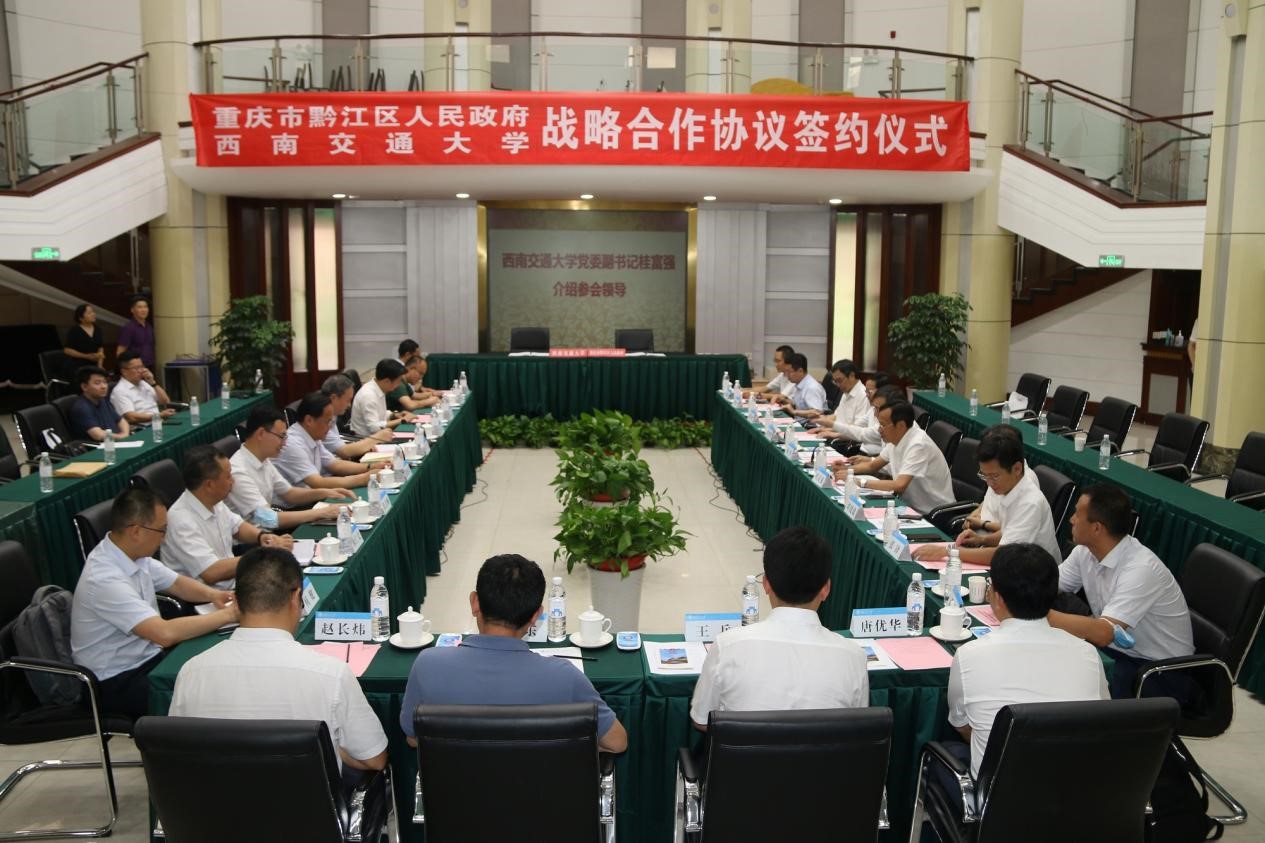 杨丹代表学校对徐江一行表示热烈欢迎,并简要介绍了西南交大的历史沿革和学科特色。他表示,只要将学校的学科、人才和创新等优势,与黔江区的产业、技术、资源等优势有机结合,双方就一定能够产出重要且具有广泛影响力的合作成果。他指出,学校将与黔江区在人才交流培养、招商引资等方面开展全方位的产学研合作,共促教育链、产业链与创新链的深度融合,校地携手、互促互补,在持续合作、深化合作中,加快推动形成以“科技创新为动能、产业发展为支撑、文旅融合为特色”的产业高质量发展体系和发展路径。