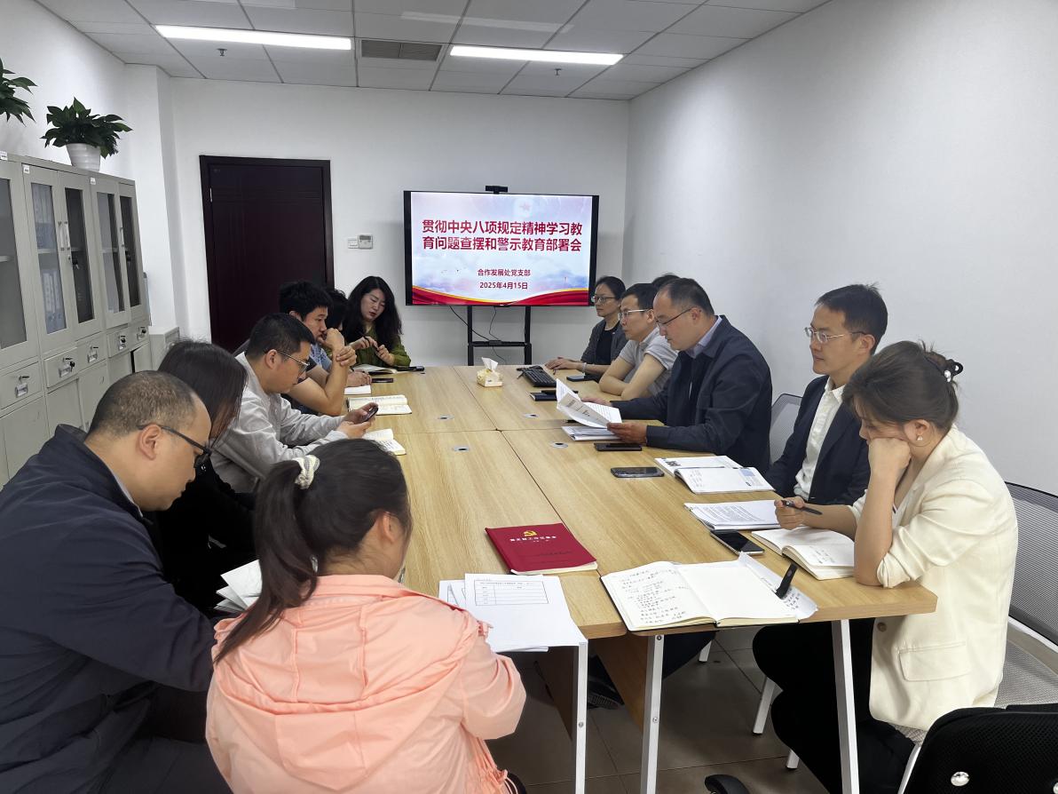 2025年4月15日上午,合作发展处党支部在综合楼735召开党员大会,开展深入贯彻中央八项规定精神学习教育问题查摆和警示教育部署会,支部书记孟新智主持本次会议。