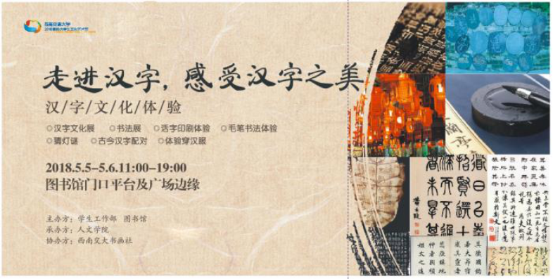 汉字,形美如画,音美如歌,意美如诗。为进一步弘扬中华传统文化,认识汉字丰富的造型变化与内涵魅力,培育交大学子的人文情怀与良好品格,2018国际大学生文化艺术节系列活动——中华优秀传统文化体验“走进汉字,感受汉字之美”将于2018年5月5日、6日在犀浦校区图书馆二楼举办,让我们一起走进汉字,在体验中感悟凝结在汉字中的中华传统文化的精髓和无限魅力,欢迎广大师生积极参与!活动由“展示类”与“体验类”两部分组成。